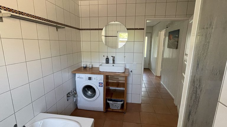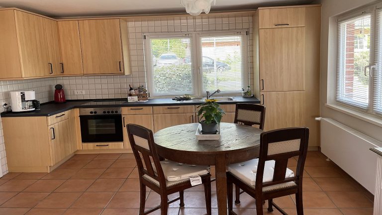 Im Erdgeschoss befindet sich der Wohnraum mit offener Küche und der Zugang zur Terrasse, sowie ein Vollbad mit Dusche, WC und Badewanne.
