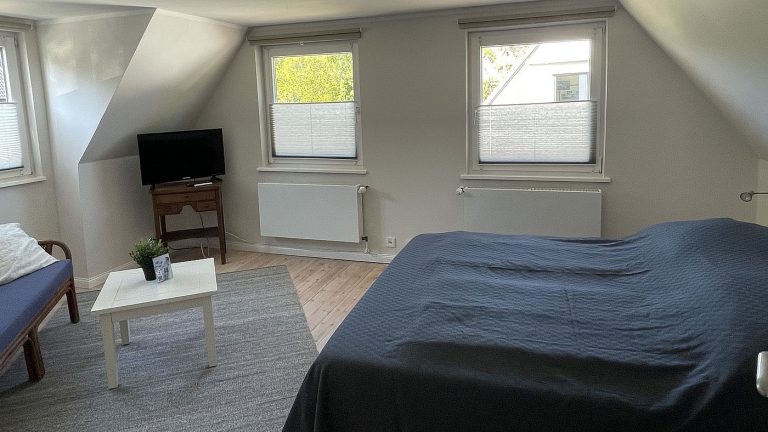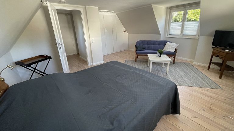 Im Obergeschoss befindet sich das helle Schlafzimmer mit einem 1,6 m breiten Doppelbett. Ein geräumiger Einbauschrank für Ihre Garderobe ist vorhanden, ausserdem ein zweites Fernsehgerät.